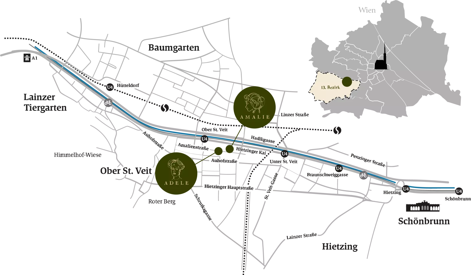 Spielplätze, Kindergärten, Schulen, Supermarkt, Bio-Greißler und Apotheke sind ebenso leicht erreichbar wie das Hietzinger Platzl, das mit seinem wöchentlichen Bauernmarkt zum Ausprobieren regionaler Köstlichkeiten lockt. Vom urigen Heurigen über legendäre Kaffeehäuser bis zu den Tafelspitz-Spezialitäten des Plachutta Stammhauses – in Ober-Sankt-Veit stimmt einfach alles. Die U4-Station Ober-Sankt-Veit ist keine 200 Meter entfernt und für kurze Wochenendtrips aufs Land ist der Dreizehnte für den Individualverkehr ebenso ideal: Im Nu gelangt man über die Westausfahrt bequem auf die A1 und A2 oder über die Tangente an jeden anderen Teil der Stadt.